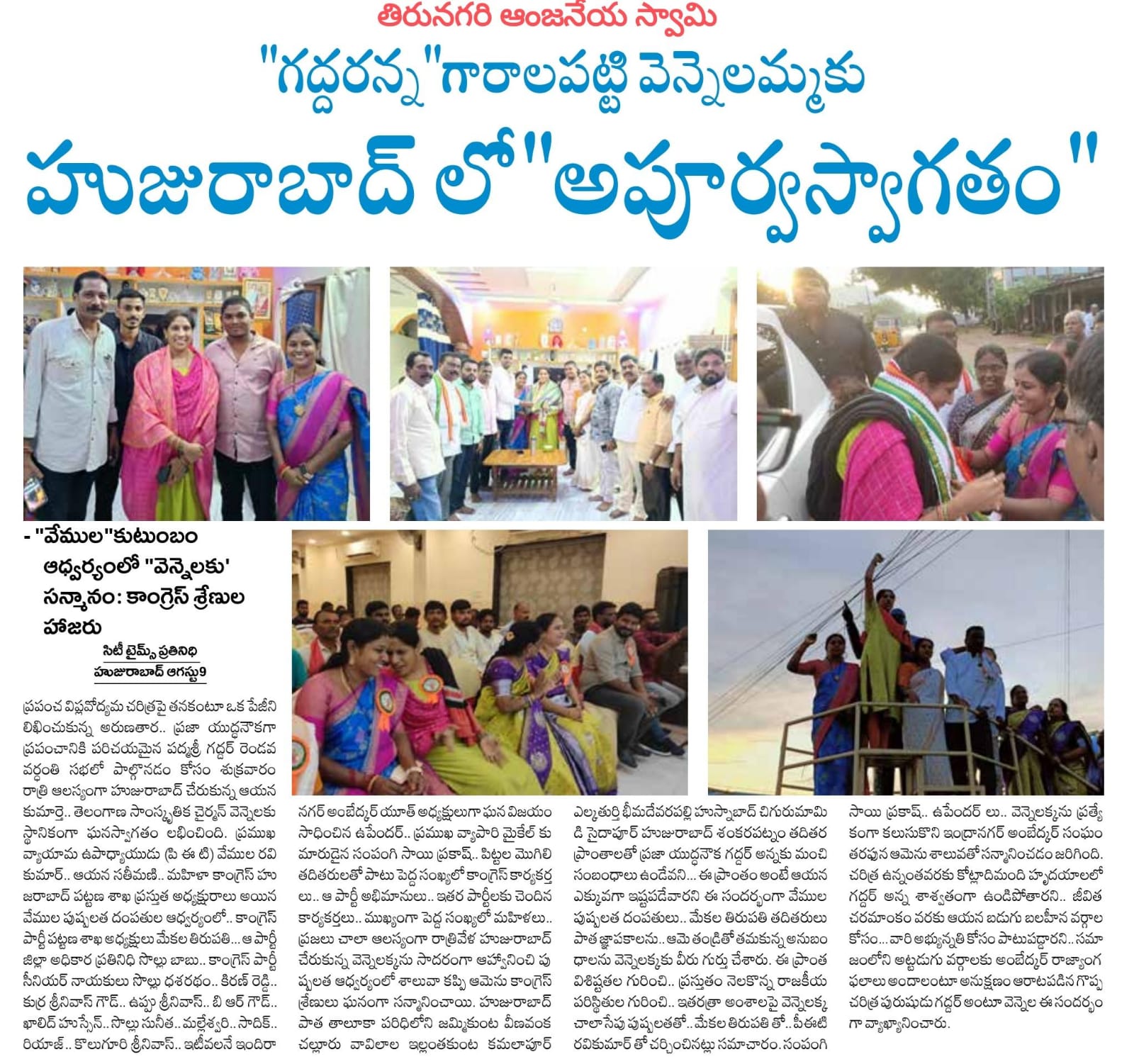 "గద్దరన్న" గారాలపట్టి వెన్నెలమ్మకు హుజూరాబాద్ లో "అపూర్వస్వాగతం"