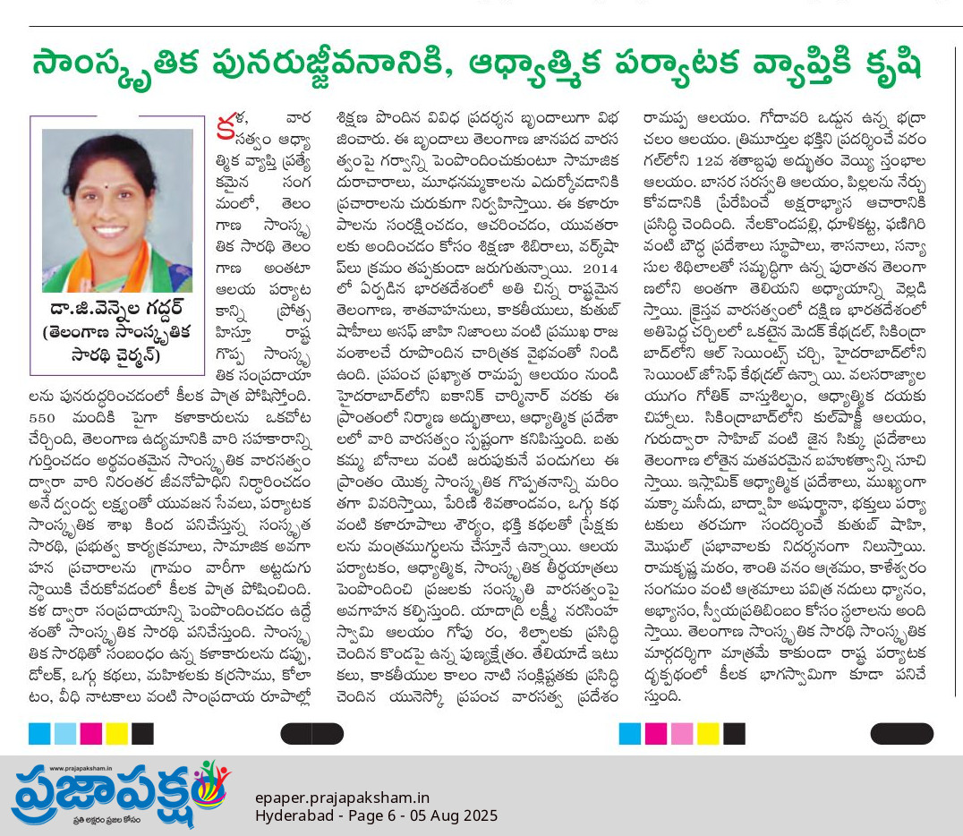సాంస్కృతిక పునరుజ్జీవనానికి, ఆధ్యాత్మిక పర్యాటక వ్యాప్తికి కృషి