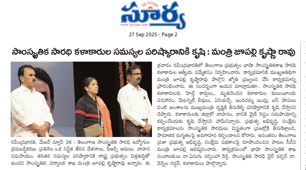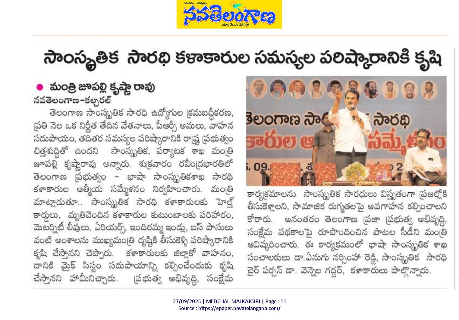సాంస్కృతిక సారథి కళాకారుల సమస్యల పరిష్కారానికి కృషి